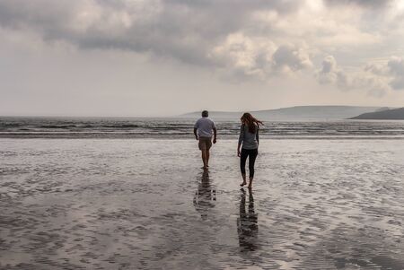 A couple take a leisurely stroll on Blackpool Beach, Lancashire, UK.