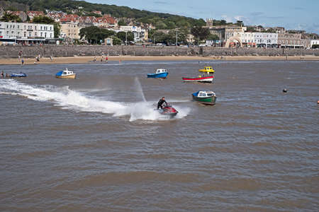 Weston-super-Mare, UK - July 28, 2019: A jet ski leaves Knightstone harbour.