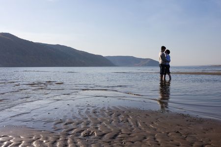 Couple walking on sandy beach leaving footprints in the sand. One father and his daughter enjoying the day. Cloudy day.
