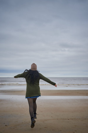 Silhouette of a woman in a blue coat standing on the edge of a cliff and looking at the sea