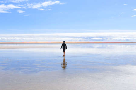 Boy dressed in black with reflection on the water walking to the beach with orange sand - Fjord in the north of Iceland Europe