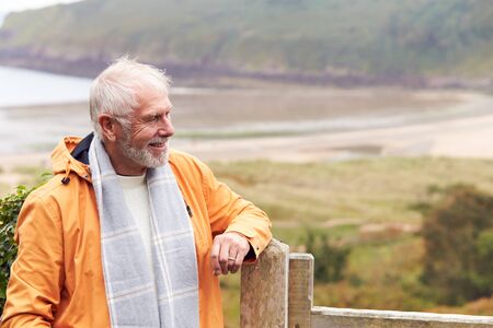 Active Senior Man Walking Along Coastal Path In Fall Or Winter By Gate With Beach And Cliffs Behind