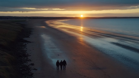 Capture the essence of tranquility as silhouetted figures walk along a serene beach at sunset, reflecting the bond of friendship against a backdrop of stunning natural beauty.