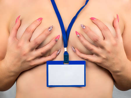 woman covering her hands chest with badge close-up