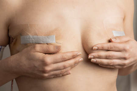 Woman shows scars following bilateral mastectomy due to breast cancer