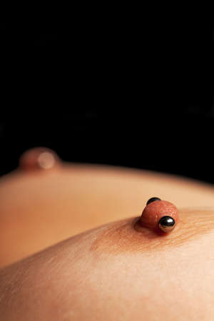 Close-up view on woman pierced nipples, with copyspace on black background