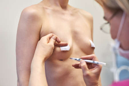 Breast Augmentation. Closeup Beautician Hands Drawing Surgical Lines On Woman Breast. Female Body With Black Marks On Breasts Before Plastic Surgery Operation