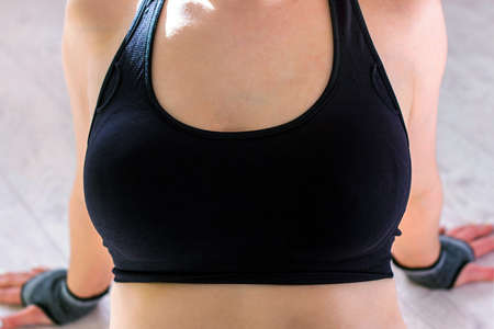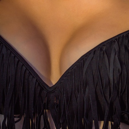 Female breast with sexy cleavage healthy skin in black swimming bra with fringe closeup background