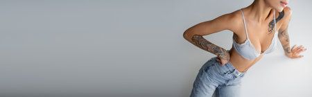 cropped view of seductive woman in jeans and bra posing with hand on hip near cube on grey background, banner