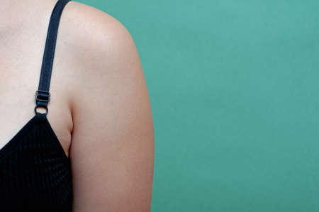 The chest of a woman in a green tank top. Close-up