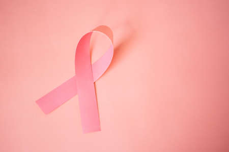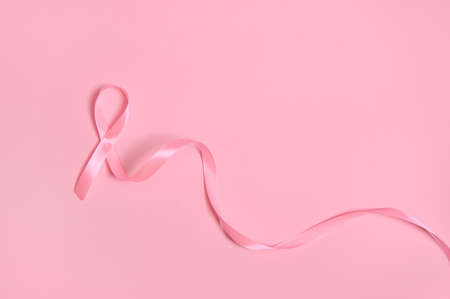 Pink Breast Cancer Ribbon with copy space on pink background. mammary cancer, Women's Health Concept.