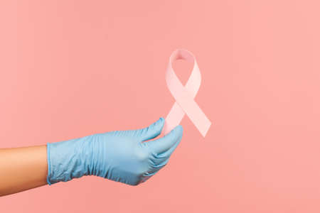 Profile side view closeup of human hand in blue surgical gloves showing and holding pink ribbon, symbol of breast cancer. indoor, studio shot, isolated on pink background.