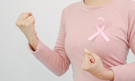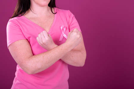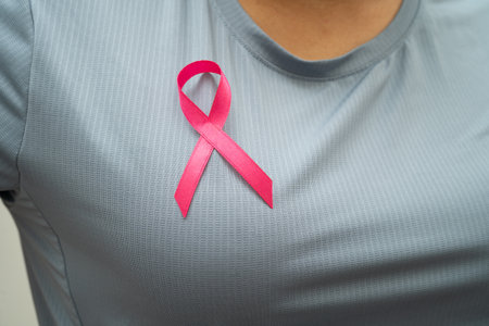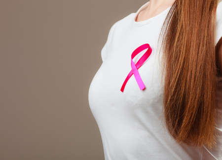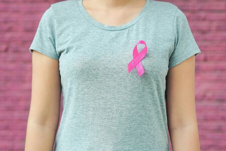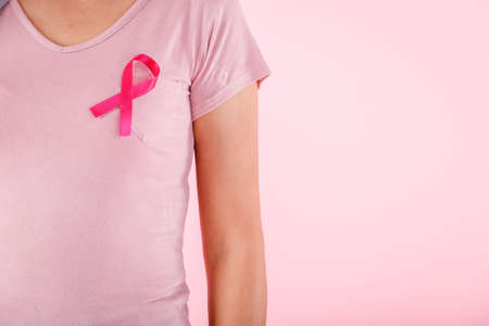 Close up of pink ribbon on woman chest to support breast cancer awareness month for fight with cancerClose up of pink ribbon on woman chest to support breast cancer awareness month for fight with cancer