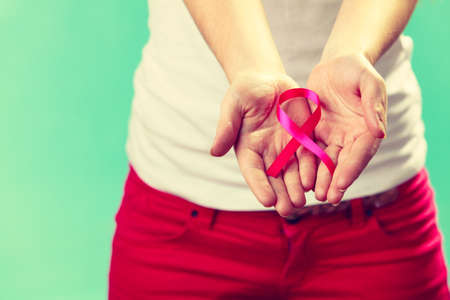 Healthcare and medicine concept - woman showing pink breast cancer awareness ribbon on hands, closeup on green