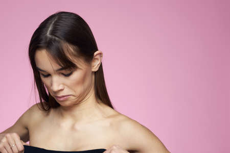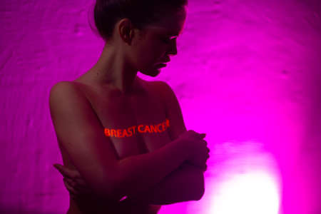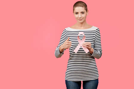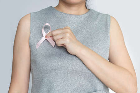 Woman wih pink cancer ribbon on chest. Healthcare, medicine and breast cancer awareness concept. Studio shot, grey background