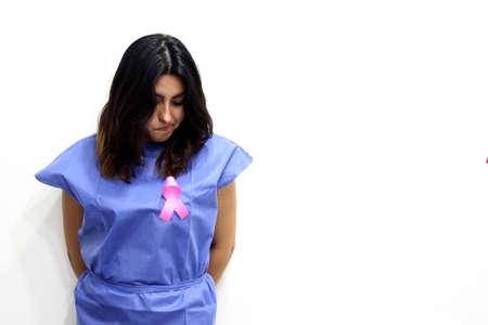 Latin woman disposable blue surgical gown and pink ribbon for campaign against breast cancer