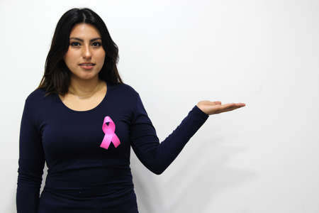 latin woman with blue blouse and pink ribbon for campaign against breast cancer on plain white background
