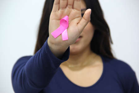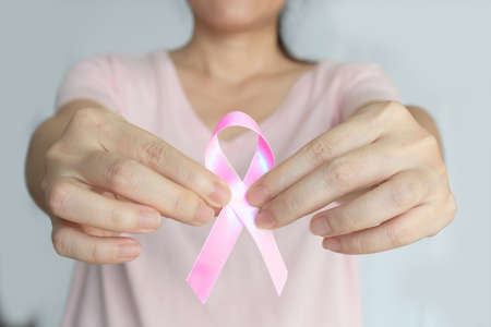 October Breast Cancer Awareness Month, Adult woman holding the Pink Ribbon to support people living with the disease. International Women's Day Concept. Space for text