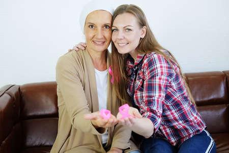Caucasian daughter and Elderly mother in white headscarf is smiling and holding Awareness pink ribbon of common cancer is symbol of various campaign activities for patients with breast cancer.