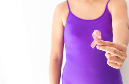 Close-up of breast cancer symbol pink ribbon in tender female hands isolated on purple background