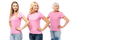 Panoramic crop of women with pink ribbons of breast cancer awareness and hands on hips looking away isolated on white