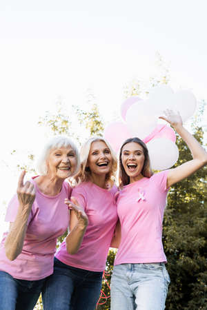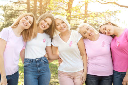 Beautiful women of different ages with pink ribbons outdoors. Breast cancer concept
