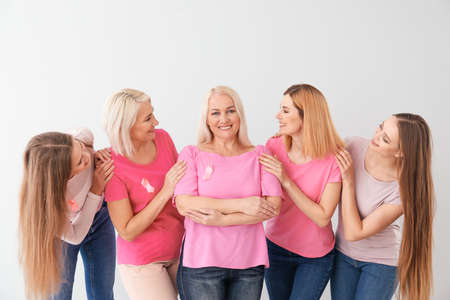 Beautiful women of different ages with pink ribbons on light background. Breast cancer concept