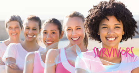 Composition of pink survivors text over group of smiling women. breast cancer positive awareness campaign concept digitally generated image.