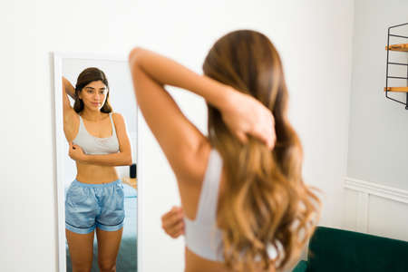Rear view of a young latin woman doing self exploration or exam in the mirror to prevent breast cancer