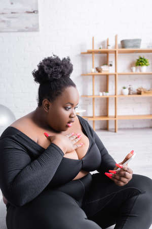 Beautiful young black woman in underwear touches chest when she suddenly feels pangs of pain in heart or breast. Copy space home background. Cardiac pain, cardiovascular disease.