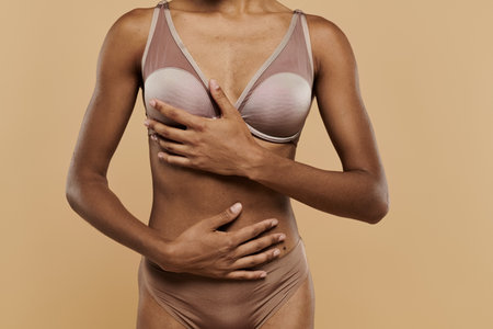 African American woman in tan bikini serenely holding her stomach on beige background.