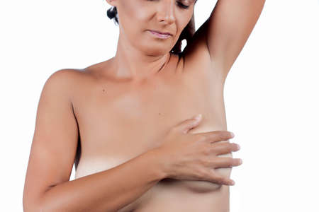 Caucasian adult woman examining her breast for lumps or signs of breast cancer
