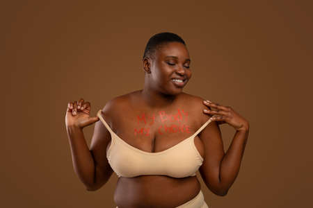 partial view of woman with body positive saved my life lettering on belly covering breast with hands isolated on dark gray