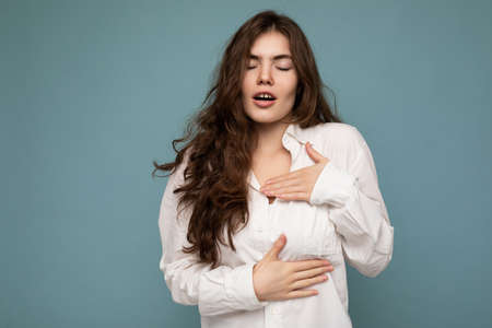 Portrait of young emotional amazed beautiful wave-haired brunette woman with sincere emotions wearing casual white shirt isolated on blue background with empty space and touches chest with hands