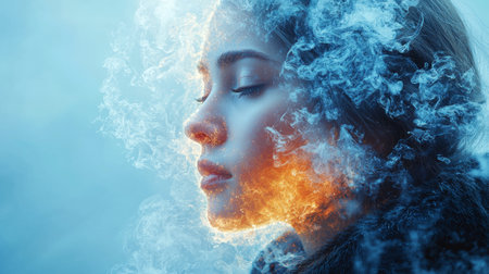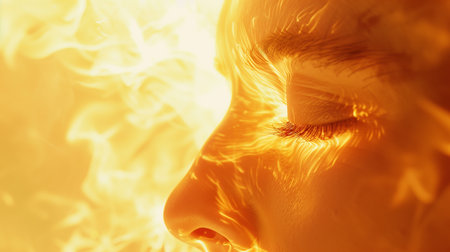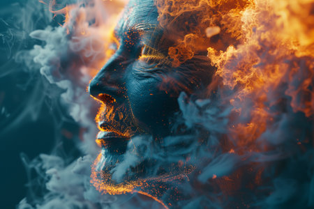 Abstract portrait featuring a face surrounded by fire and smoke elements, creating a dramatic and artistic visual. Ideal for abstract art, fantasy, and expressive themes.