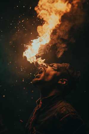 A fire eater bravely swallowing flames and breathing fire into the air mesmerizing the audience with daring feats of courage