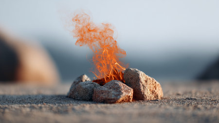 Orange flames rising from a small bonfire made of rocks on a sandy beach, creating a warm and inviting atmosphere during a summer camping trip