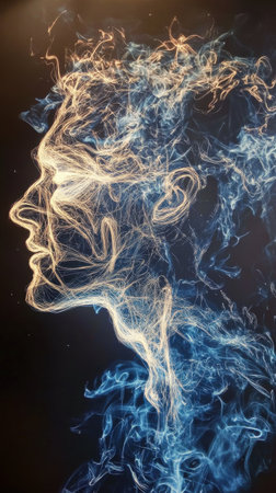 A mystical representation showcases the profile of a man, his features intertwined with dynamic smoke-like patterns in blues and golds. This artwork captivates with its ethereal quality.