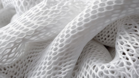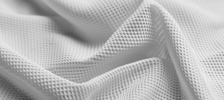 Detailed shot highlights the intricate abstract waves texture of white soft fabric, revealing a porous texture and round fiber cells. Creative for promotional materials. Banner.Generative AI
