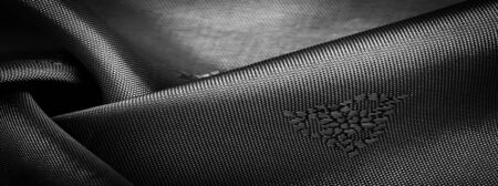 Texture, background, pattern. The fabric is black, with a metal sheen, the material allowing the light to pass through it so that the objects behind are clearly visible.