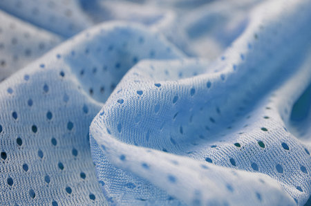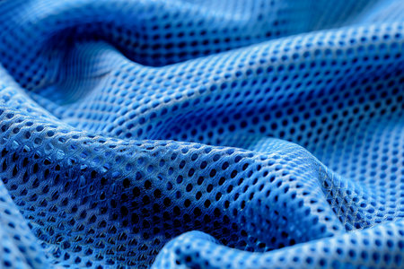 A bright blue sports fabric with visible mesh holes, designed for ventilation. The fabric is laid out with a few creases, allowing the texture to catch the light and display the breathability of the material.