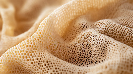 Intricate close-up reveals a light beige honeycomb mesh texture, the fabric draped with a rippling effect, highlighting the hole patterns in detailed perspective.