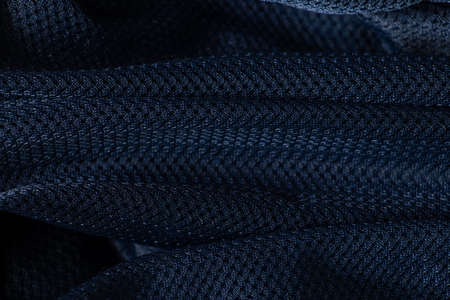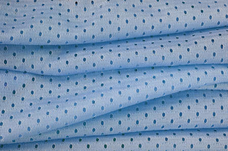 Blue mesh sport wear fabric textile pattern background. Blue color football jersey clothing fabric texture sports wear. Breathable porous poriferous material air ventilation with small holes