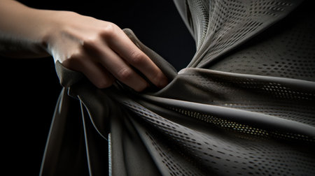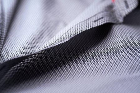 Synthetic polyester fabric with holes. Abstract background. A wave-folded piece of fabric in gray or silver color. Neatly hemmed fabric