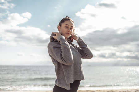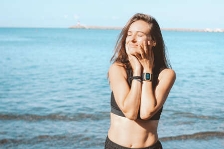 Portrait of an attractive fit slim woman in sportswear on the beach at bright sunny day