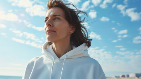 A woman wearing a white hoodie is standing outside on a sunny day. She has a smile on her face and is looking up at the sky