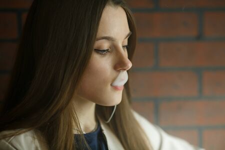 Vaping teenager. Young pretty white girl smoking an electronic cigarette in vape bar. Bad habit.