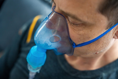 Asthma Patient Breathing Using Oxygen Mask And COPD Nebulizer