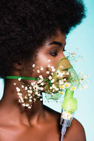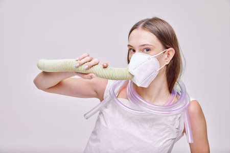 Close-up portrait of young beautiful girl taking deep breath in special mask isolated over grey background. Concept of ecology, environment safety, retro fashion, art photography, style, queer, ad