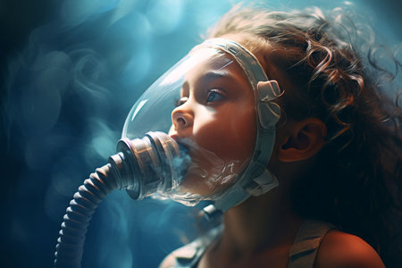 Kid wearing nebulizer at home therapy. Cute ill girl. Generate AI